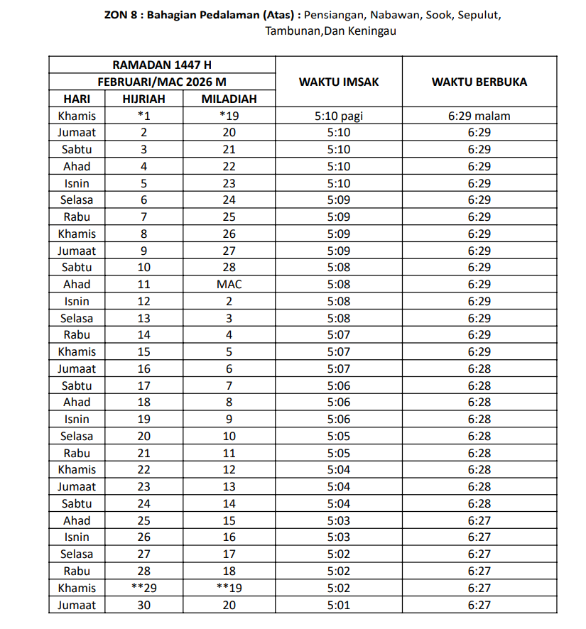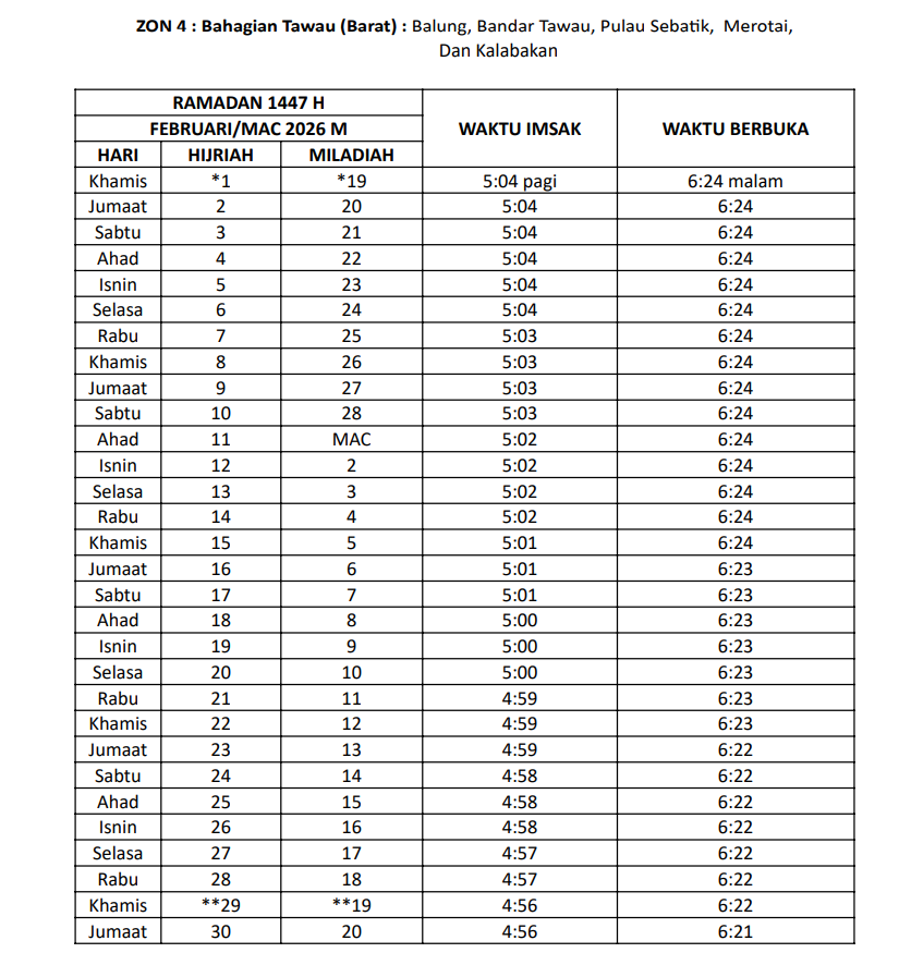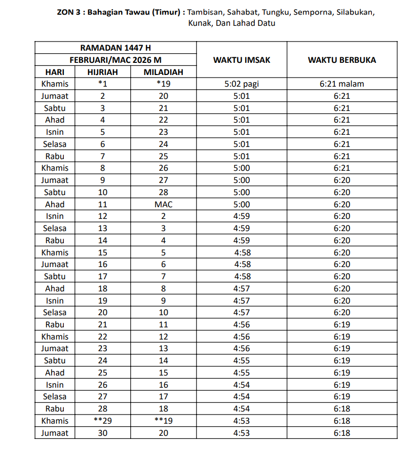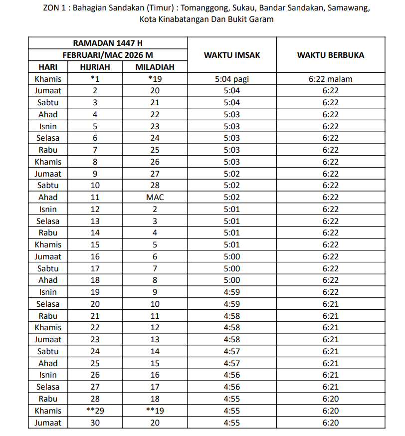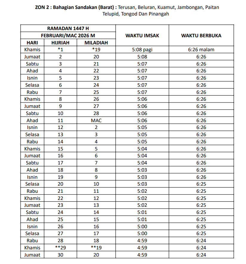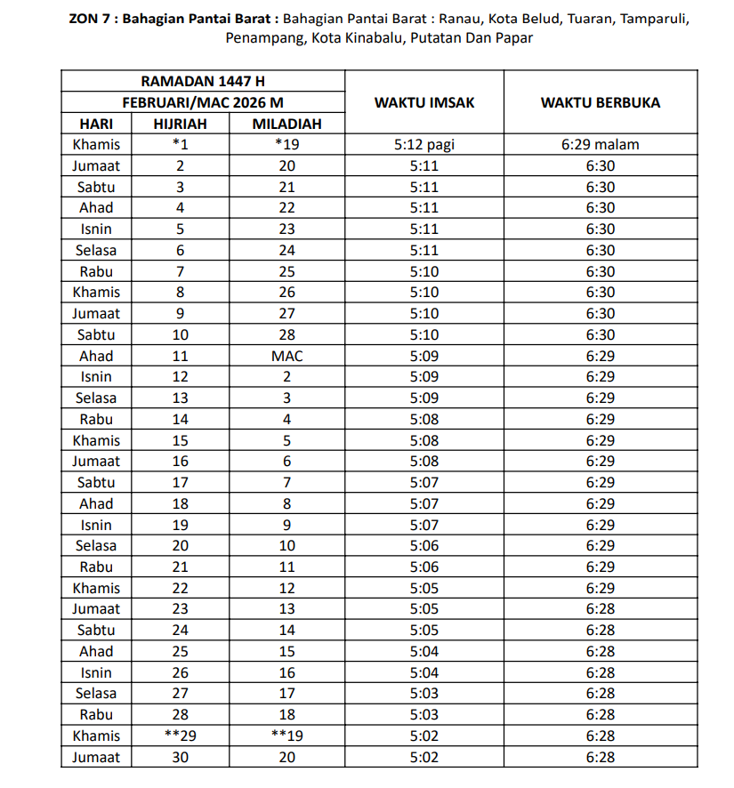 Berikut kami kongsikan jadual berbuka puasa dan Imsak bagi negeri Sabah tahun 2026 bersamaan 1447H. Jadual ini diambil dari laman rasmi JAKIM.