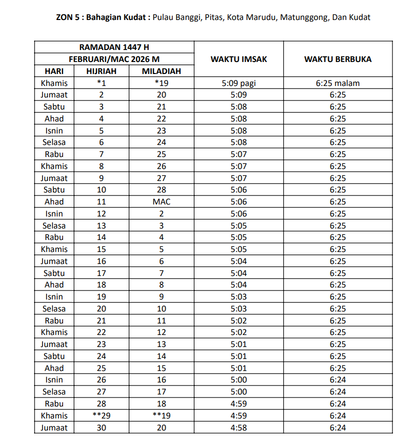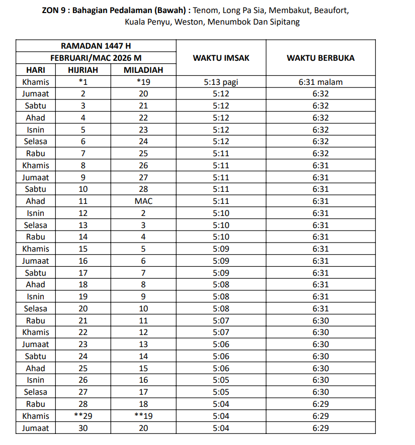 Jadual Waktu Berbuka dan Imsak Sabah 2026 /1447H